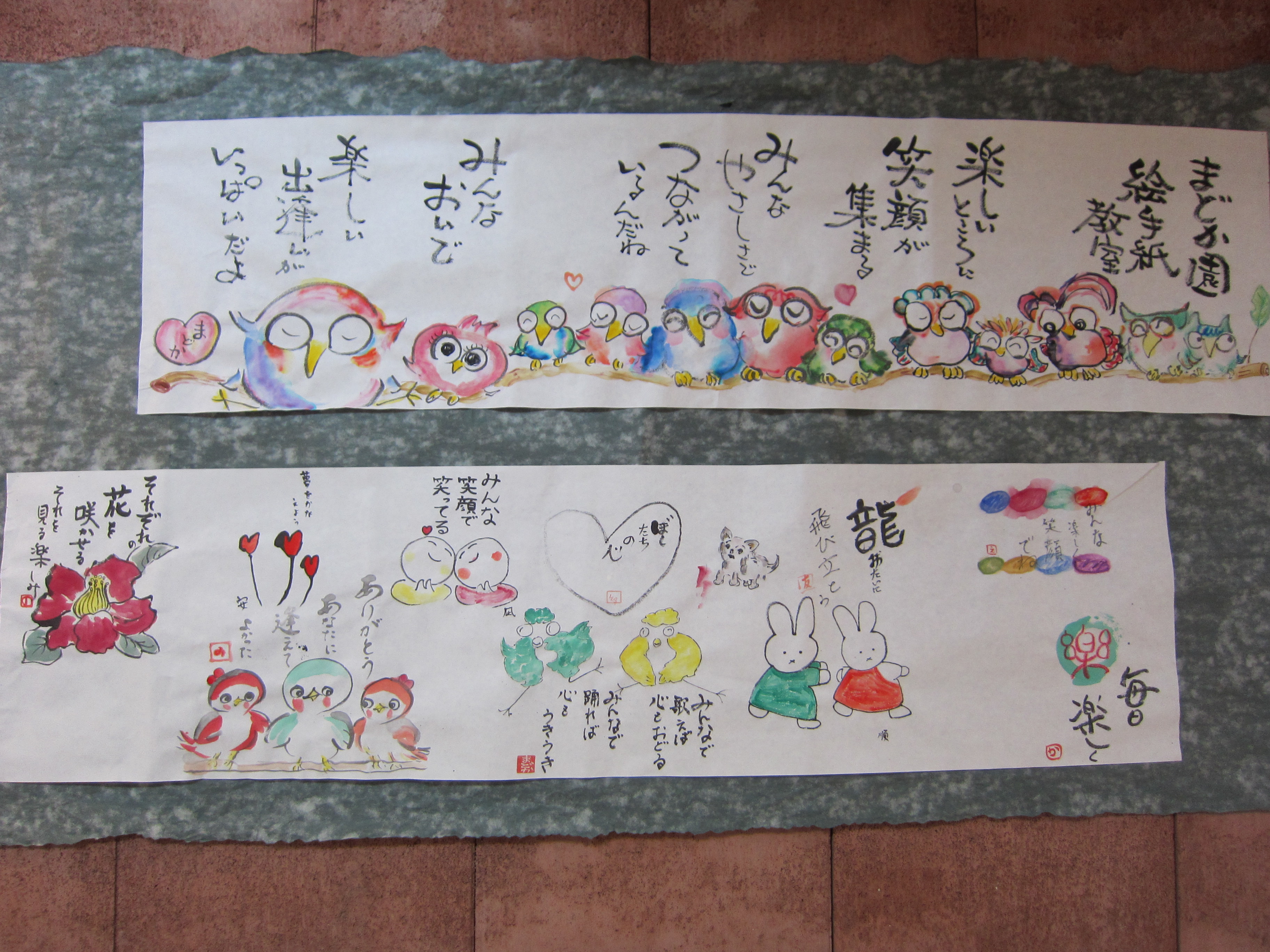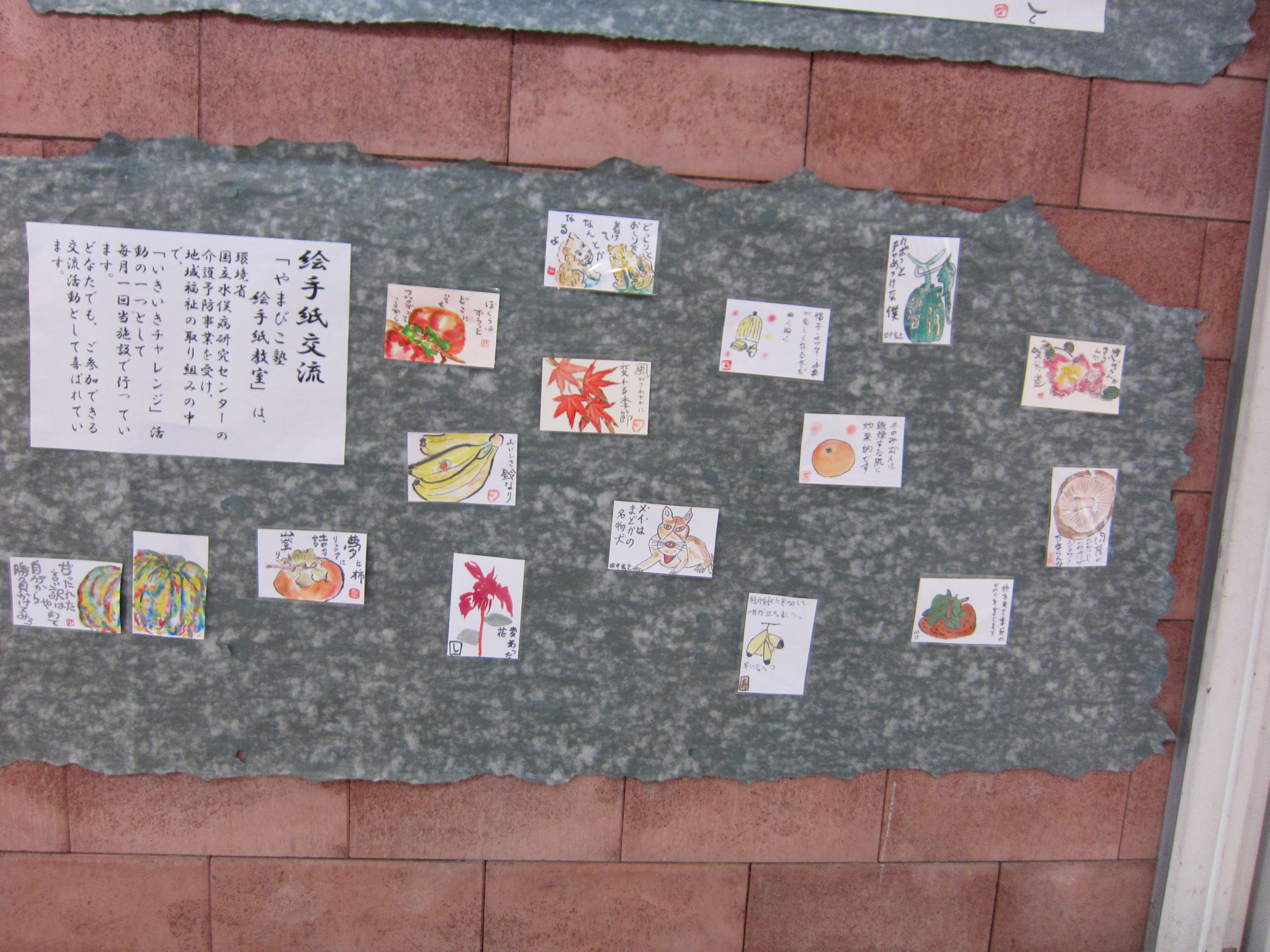 「まどか園・支援センターまどか」では、絵手紙を阿蘇風の丘美術館の大野勝彦先生の絵手紙教室の先生方たちに教わっています。 |