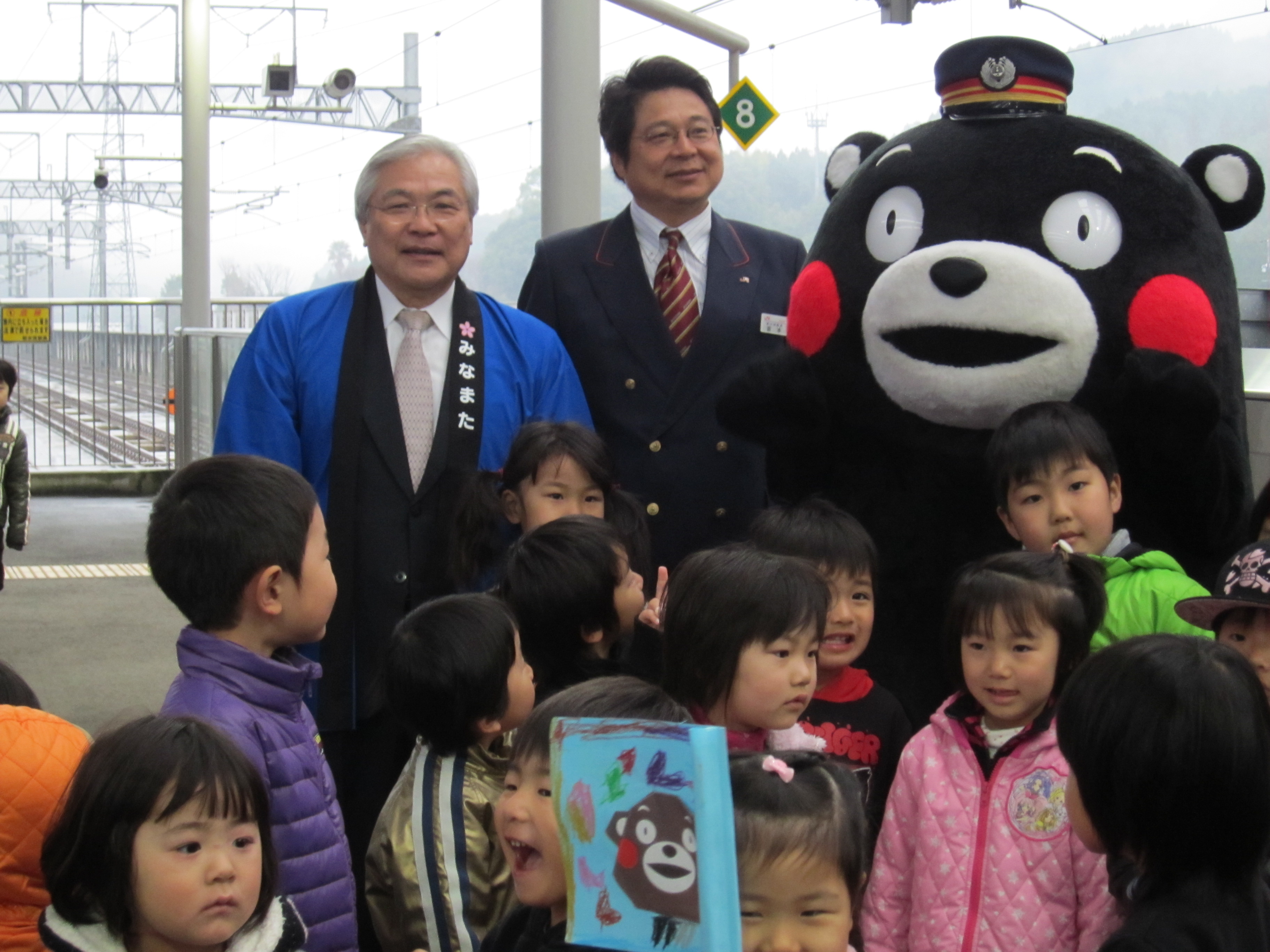 園児たちと宮本水俣市長、宮本新水俣駅長&人気のくまモン