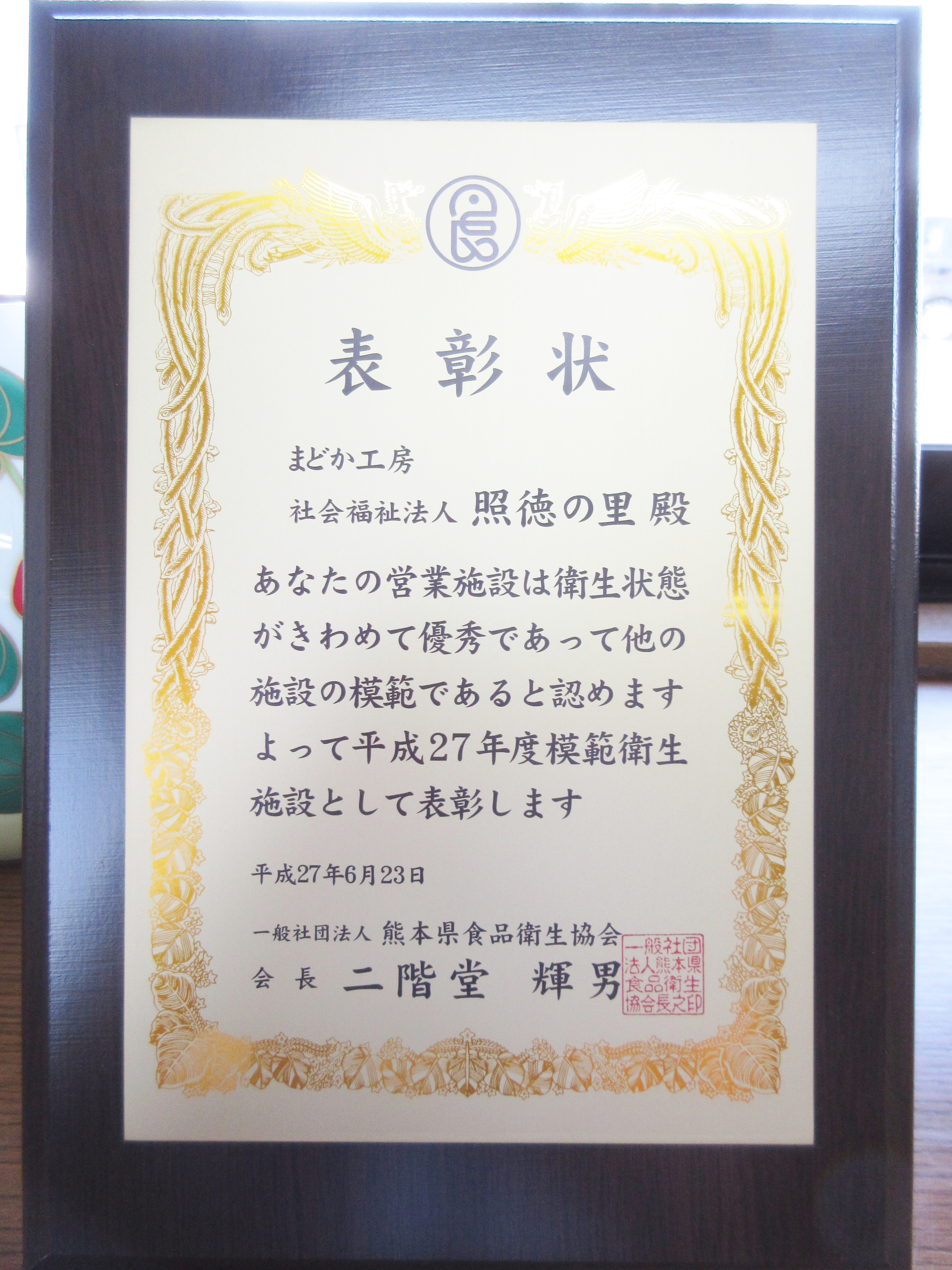 熊本県食品衛生協会より平成27年度模範衛生施設としてまどか工房が表彰されました。表彰式は平成27年6月23日ホテルメルパルク熊本で行われました。今後も施設をきれいにして行きたいと職員を始め利用者さんも大喜びです。